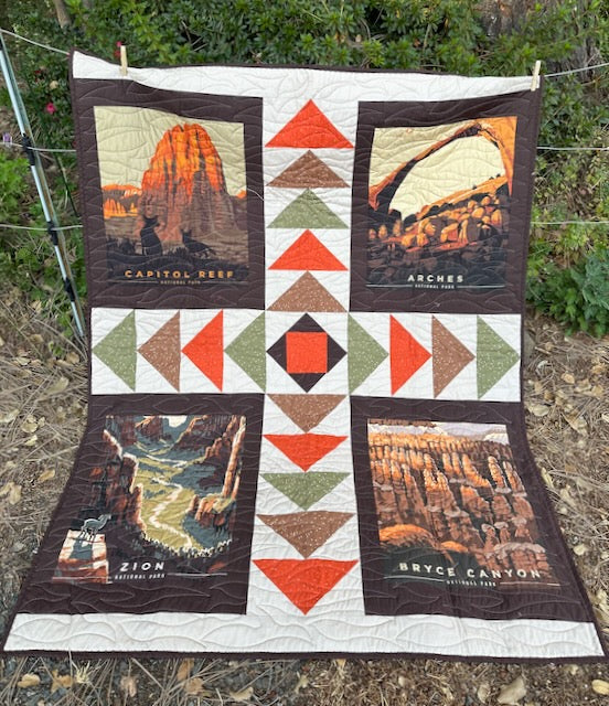 Discover the warmth and beauty of the Adobo quilt, a stunning piece measuring 50in x 60in, perfect for adding a touch of rustic charm to any home or business setting. This quilt features a captivating design with a central cross pattern, surrounded by panels that evoke the serene beauty of a desert landscape at sunset. The intricate patchwork includes triangles in earthy tones of green, brown, and beige, harmoniously blending with the scenic fabric prints. Designed by Heidi Cook for Villa Rosa Designs, this quilt is not only a functional piece but also a work of art, ideal for both personal comfort and as a unique gift or decor item in a retail environment.