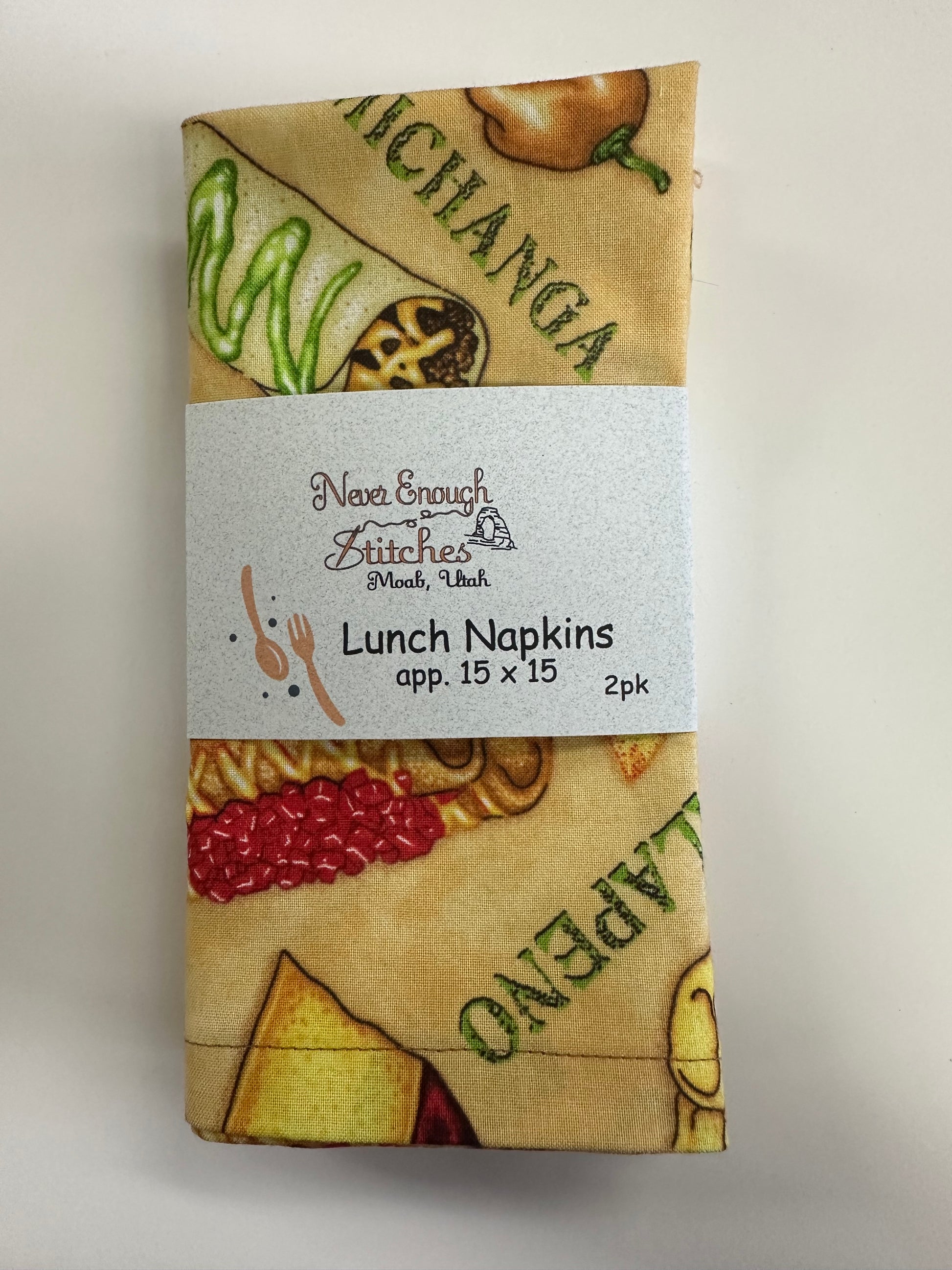 We sew our napkins right here in Moab Utah using the best quality cotton fabric available. We prewash and dry the fabric before making the napkins. This gives you an easy-care napkin which can be machine washed and dried without severe wrinkling or twisting. The napkins are expertly sewn with half-inch finished hems and mitered corners.