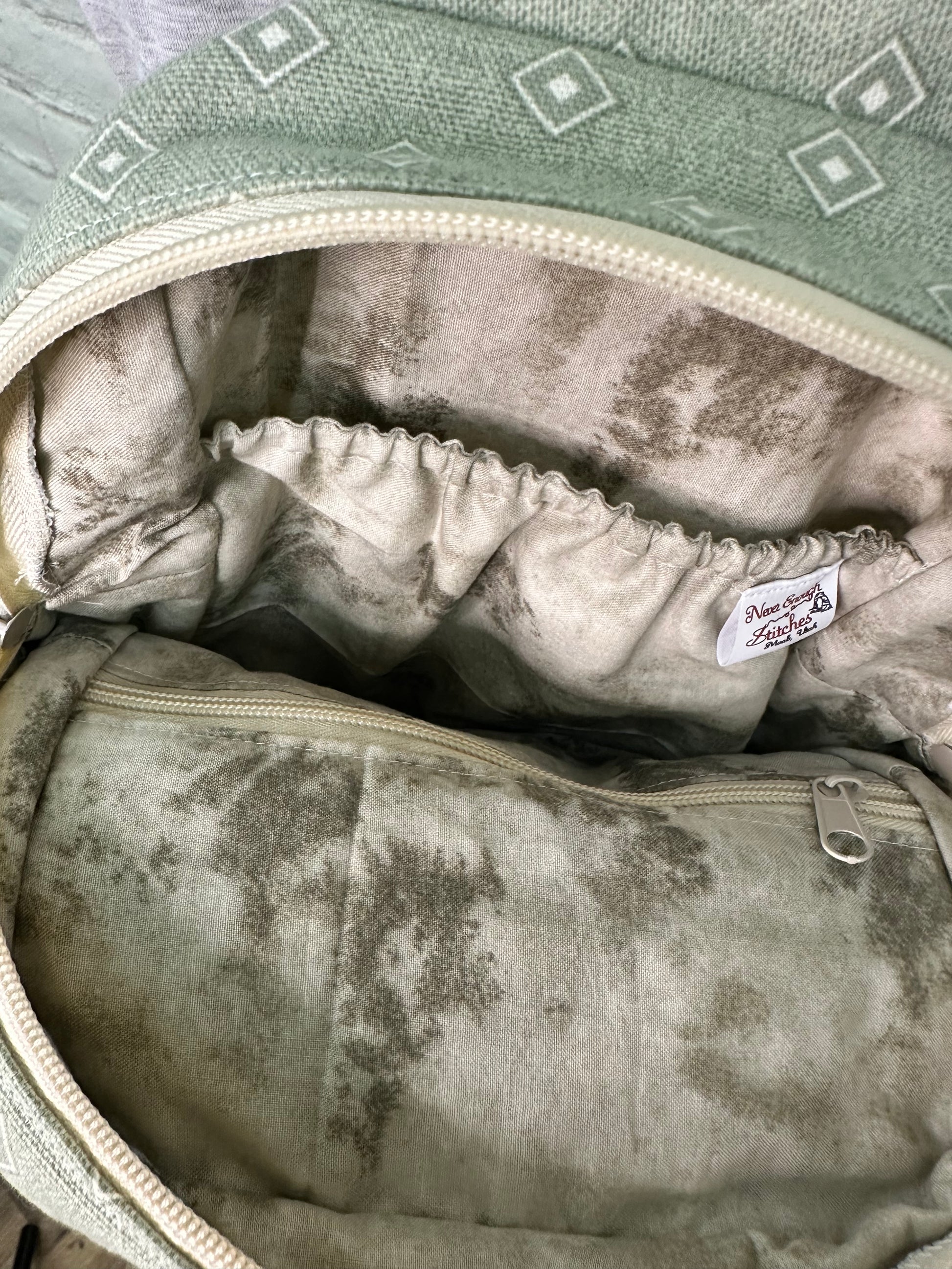 Inside zipper pocket and elastic pocket.