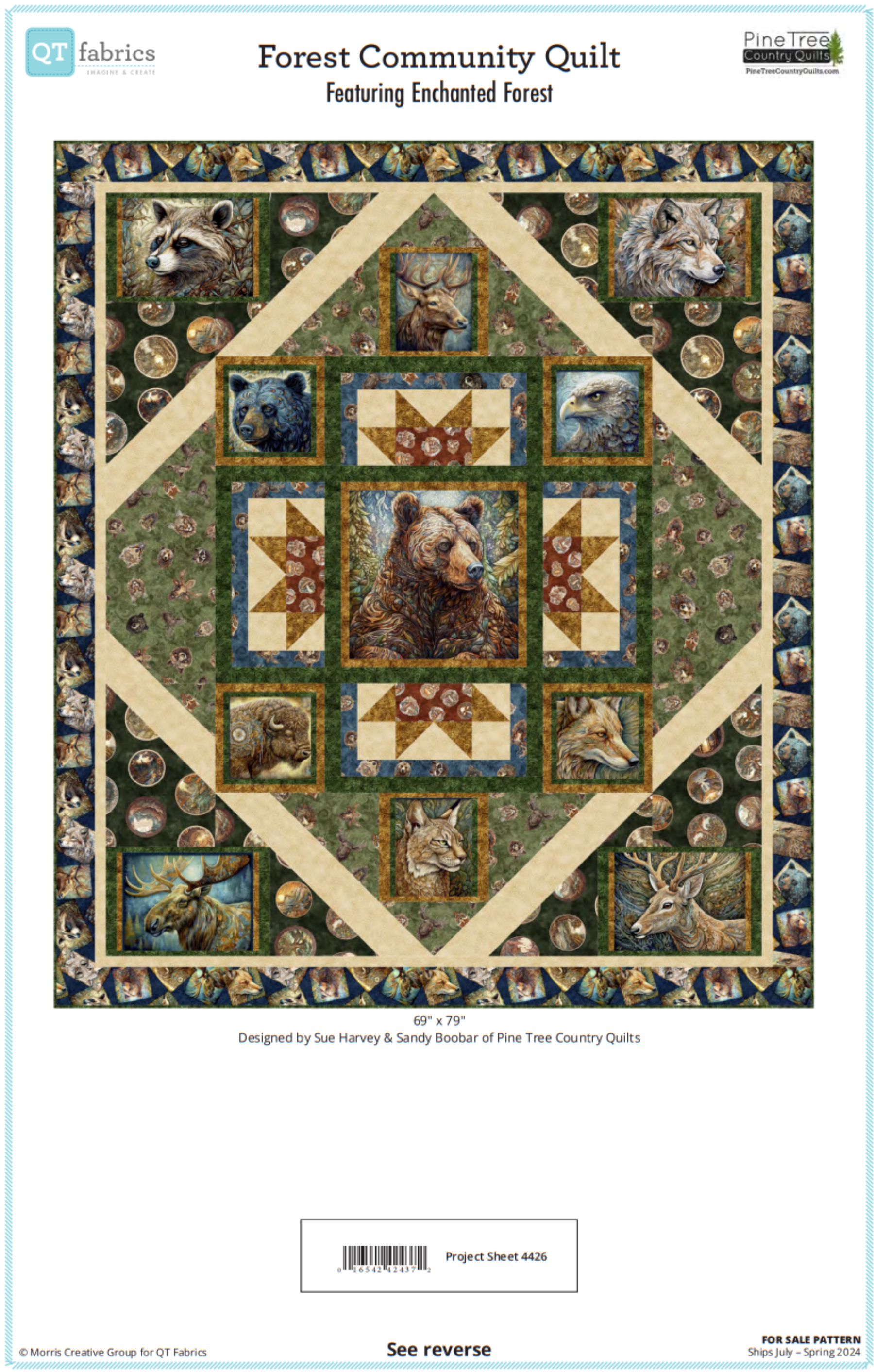 Majestic animals styled in a unique decorative style with rich jewel-tone colors. Anchored by a large, sophisticated patch panel and decorative stripe, this collection brings the magic of nature to life with plenty of coordinates to mix and match. Decorative forest circle motifs and mushroom designs bring even more intrigue and creative opportunity to this new collection. ©Morris Creative Group.