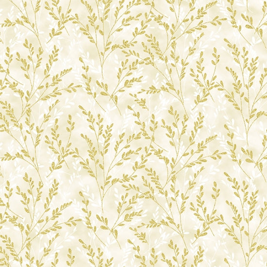 100% cotton screen print with metallic accent. Approx. 44” wide.