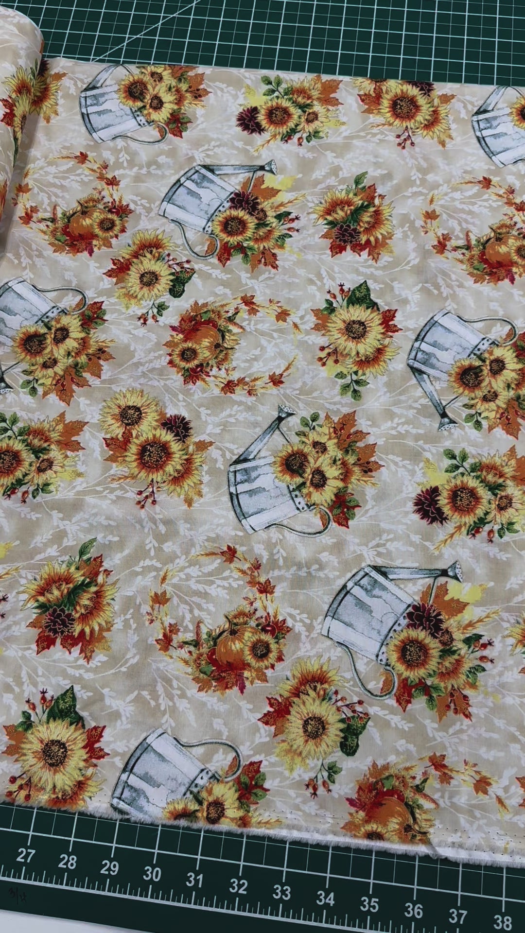 100% cotton screen print with metallic accent. Approx. 44” wide.