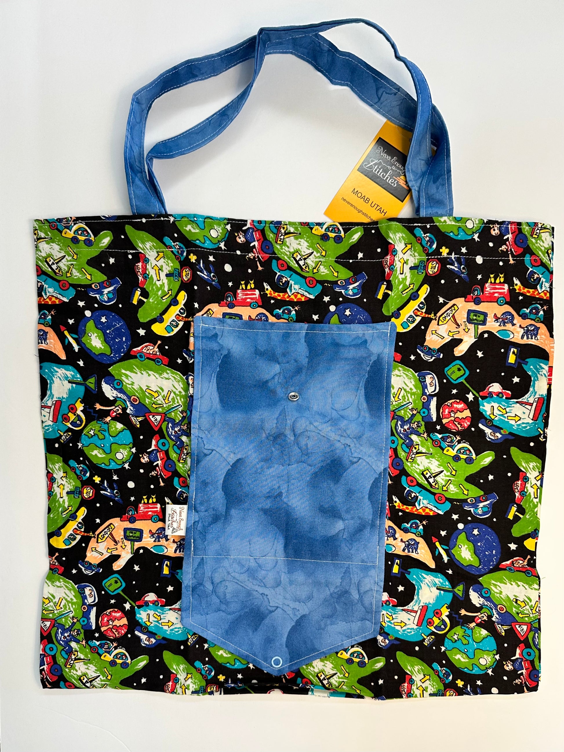 Reusable shopping bag that can be folded into itself, with an easy to carry handle.