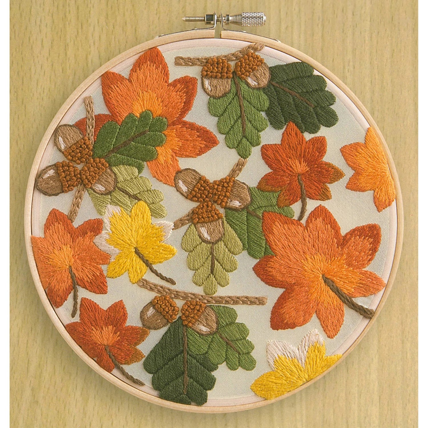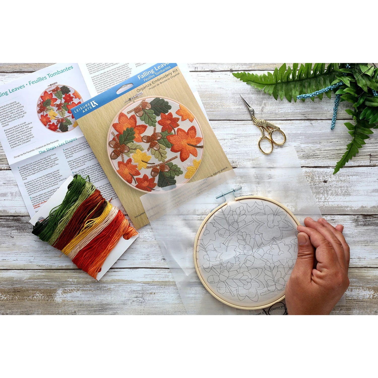 Leisure Arts Embroidery Kit 6" Organza Leaves- Design features fall colored leaves and acorns on stamped white organza, no transfer necessary. Contains: 6" hoop, 11 fabulous fall floss colors, organza, needle, and easy-to-follow instructions.