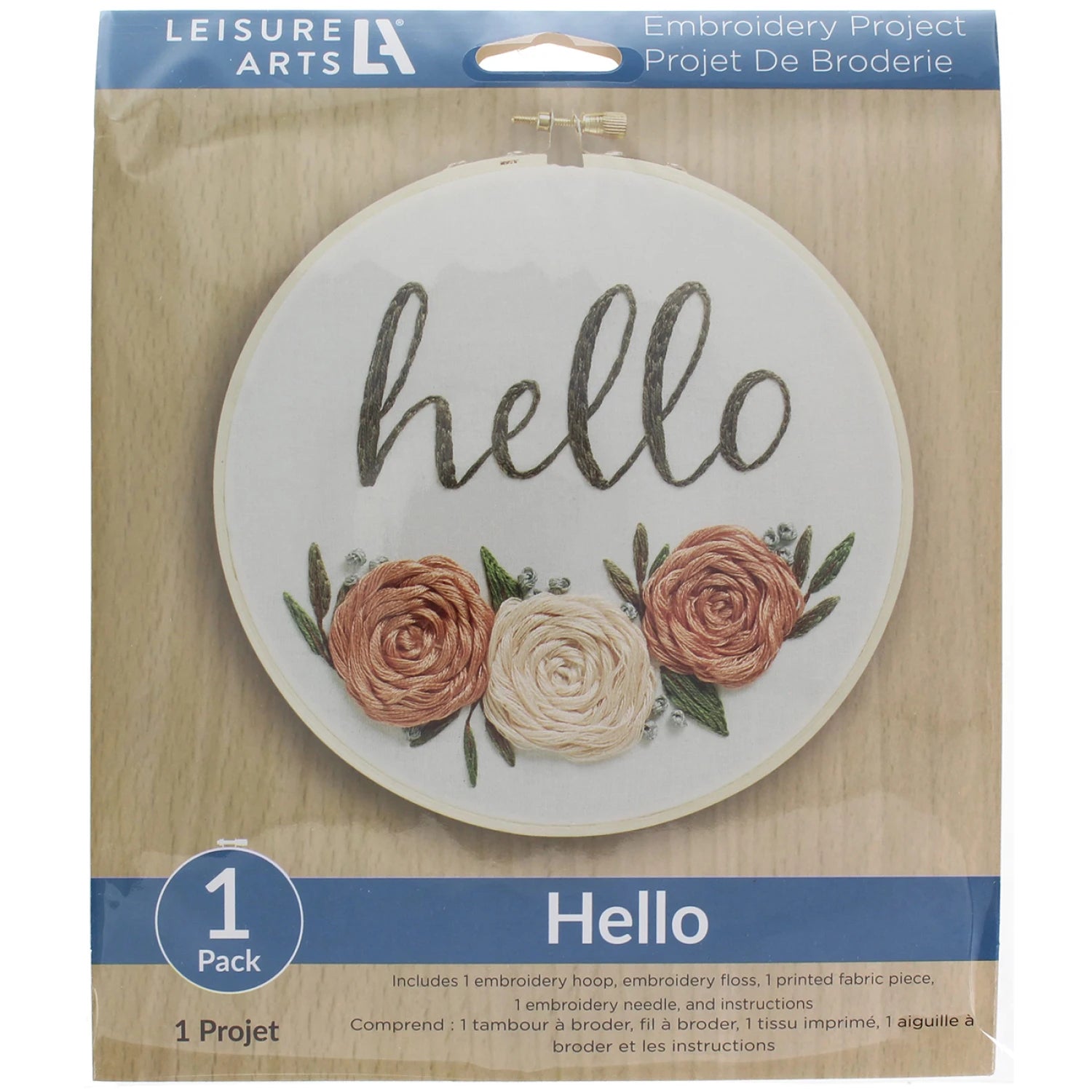 Leisure Arts Embroidery Kit 6" Hello- Printed embroidery design features dimensional roses under the caption: hello. Includes 6" wooden embroidery hoop, embroidery floss, printed fabric, embroidery needle and full-color, step-by-step instructions. Use the embroidery hoop to keep the fabric taught and then to display your project. Makes 1 design. Colors and contents may vary.