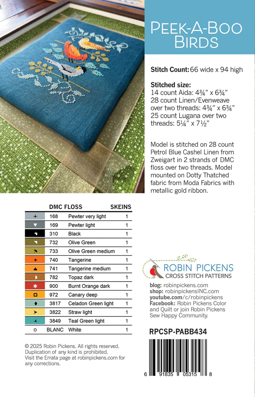 Peek-A-Boo Birds cross stitch design shows three bird friends peering through fancy leaves. The cover model is shown stitched on Zweigart Petrol Blue 28 count Cashel Linen with DMC flosses.