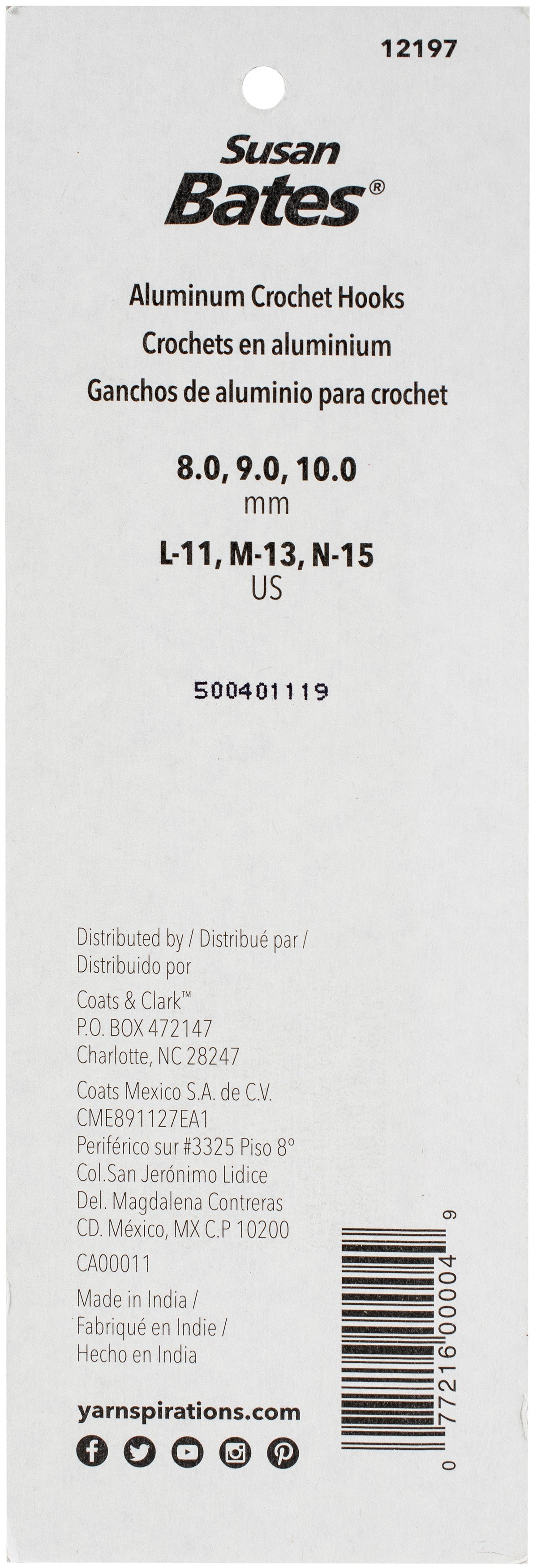 These hooks have the broadest size range within the Susan Bates family of hooks. Made of lightweight aluminum, each Silvalume hook undergoes a special anodizing process, which etches away all surface impurities. In addition, each hook is heat treated for strength and durability and polished for a velvety smooth finish. The famous in line head helps reduce wrist motion for fatigue free crocheting and helps you maintain a more consistent gauge. This package contains one 8mm hook, one 9mm hook and one 10mm hook. Imported.